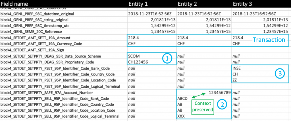 The latter feature allows to get all attributes belonging to the specific entities in separated columns. For example and because the context is preserved from the original message, it is possible to deduce that the value Account Number = 123456789 belongs to Entity 2 in the below picture.